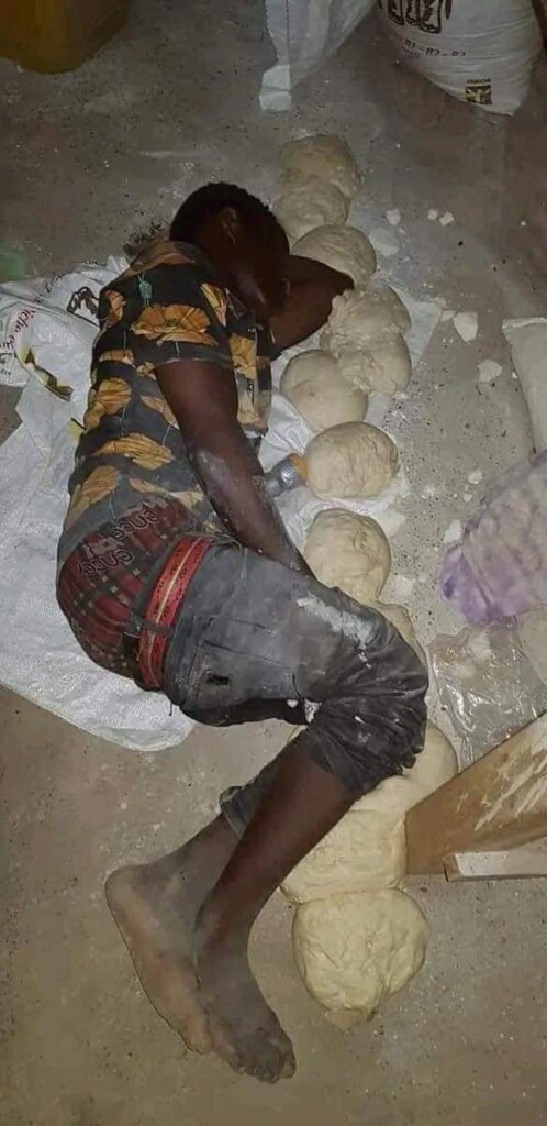 وظهر من خلال الصور، أحد عمال المخبز يغط في نوم عميق وسط عجين الخبز، ملتصقا به بجسده وملابس المتسخة، وواضعا هاتفه النقال على طاولة عجينة جاهزة من ناحية أخرى.