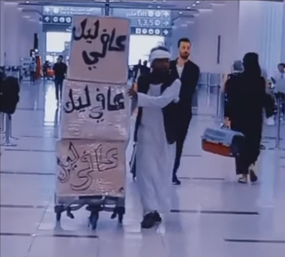 شاهد بالصورة والفيديو.. آخر تقليعات المغتربين السودانيين.. شاب سوداني “يجر” عربة بإحدى المطارات العالمية محملة بــ(العفش) ومكتوب عليه عبارة (عافي منك)