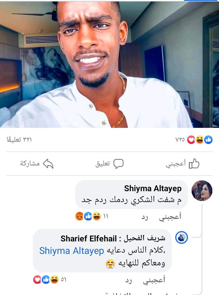 وبحسب متابعات محررة (كوش نيوز) عدد من جمهوره على الصفحة سأله عن كيف استطاع أن يظهر بذلك المنظر امام السيدات، بينما علق البعض منهم ساخرا ومستفزا له ببعض الكلمات ولكن الفحيل تجاهل الهجوم، واكتفي بقوله ” كلام الناس دعاية معاكم انا للنهاية”.