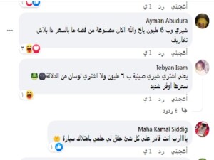 وعلق كثيرين على منشور الشركة بعبارة واضحة لسان حالها ( ما عندنا قروش) وسعركم غالى وقال اخرين ان التطورات العالمية في مجال صناعة السيارات تجاوزت ما اعلنته الشركة من مميزات للسيارة الميني Chery QQ وطالب بعض المعلقين الشركة بالابتعاد عن تصنيع السيارات الصينية غير المرغوبة لا تتوائم مع الطرق السودلنية.