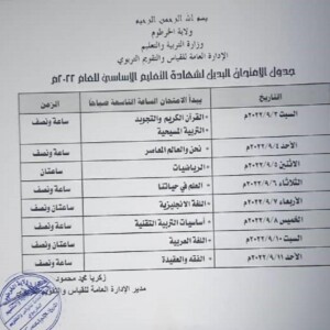 وجاء الجدول بحسب سونا، على النحو الآتي: القرآن الكريم والتجويد – التربية المسيحية يوم السبت 3-9-2022، الزمن ساعة ونصف ، نحن والعالم المعاصر يوم الأحد 4-9-2022 ، الزمن ساعة ونصف، الرياضيات ، يوم الاثنين 5-9-2022، الزمن ساعتان ، العلم في حياتنا يوم الثلاثاء 6-9-2022، الزمن ساعة ونصف ، اللغة الانجليزية يوم الأربعاء 7-9-2022 ،الزمن ساعتان ونصف ، أساسيات التربية التقنية يوم الخميس 8-9-2022، الزمن ساعة ونصف ، اللغة العربية يوم السبت 10-9-2022 ، الزمن ساعتان ونصف ، الفقه والعقيدة يوم الأحد11-9-2022 ،الزمن ساعة ونصف.