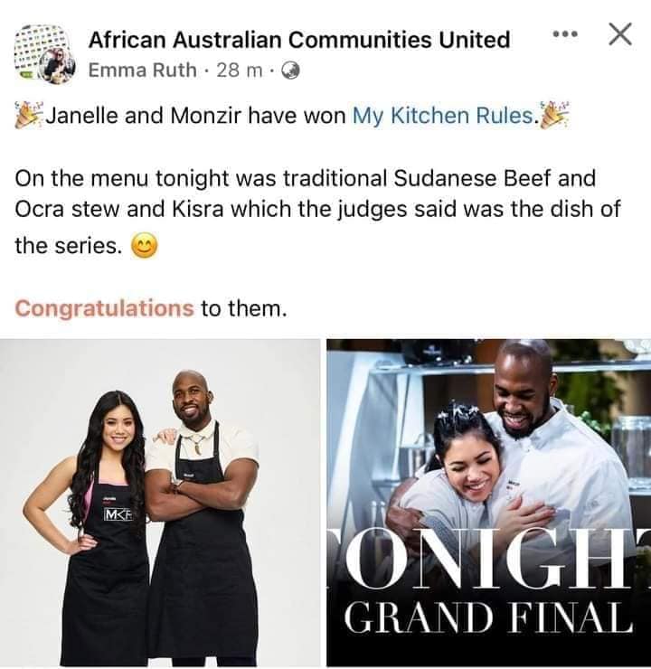 فاز الشاب السوداني منذر وصديقته جانيلا في مسابقة (My Kitchen Rules)، لأفضل (طبق او أكلة محلية) والتي تبلغ قيمة جائزتها 100.000دولار استرالي.