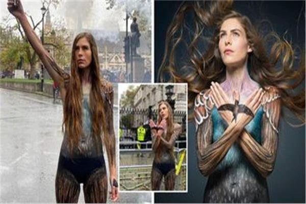 وظهرت هانا البالغة من العمر( 36) عاما، بشعرها الجامح بطول الخصر، أمام أبواب داونينغ ستريت (مقر الحكومة البريطانية)، وسارت عبر هايد بارك، بينما كان جسمها مطلي بطلاء داكن اللون وعلى ظهرها رسمات لطيور.
