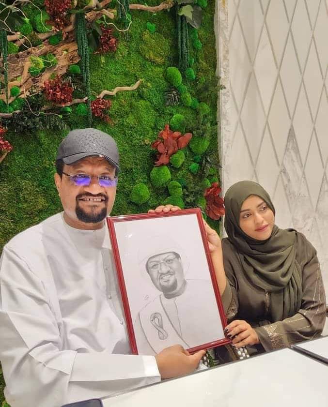 بعد أن قامت برسم صورته على لوحة التقى شيخ الأمين بالرسامة أريج وقاما بتوثيق تلك اللحظة التي جمعتهم سوياً.