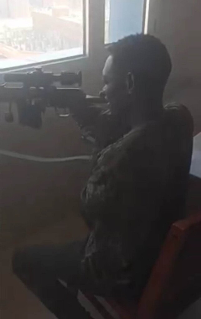 وثق اثنين من القناصين بالقوات المسلحة السودانية وعبر مقطع فيديو لحظة مباشرة مهامهم من إحدى البنايات العالية بالعاصمة السودانية الخرطوم.