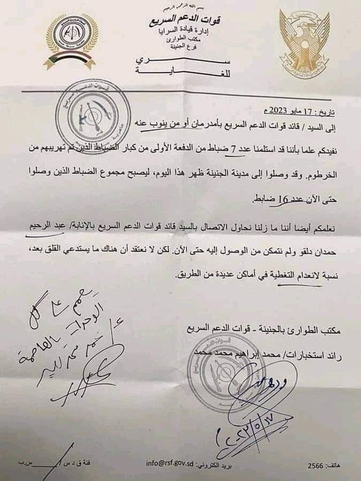 بعثت إدارة قيادة السرايا مكتب الطوارئ فرع الجنينة بالدعم السريع غربي السودان بخطاب وصفته بالسري للغاية إلى قائد قوات الدعم السريع بأم درمان أو من ينوب عنه.