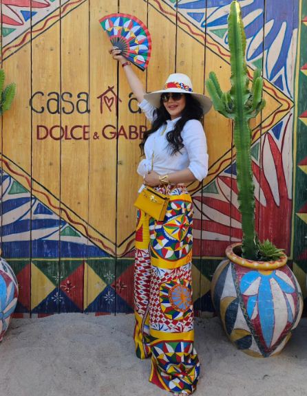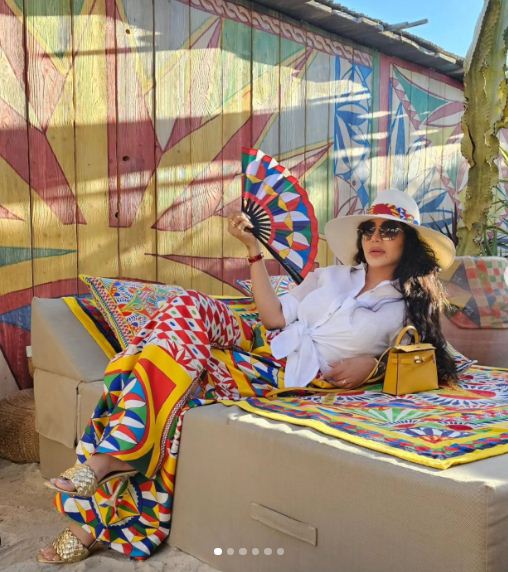 وجاءت إطلالتها مفعمة بالبهجة والسرور بألوان الربيع، حيث ارتدت قميص أبيض فضفاض ونسقت عليه بنطال طويل واسع صمم من قماش ناعم بالألوان الزاهية لتتناغم مع إطلالتها الصيفية، فيما انتعلت صندلًا بكعب عال.