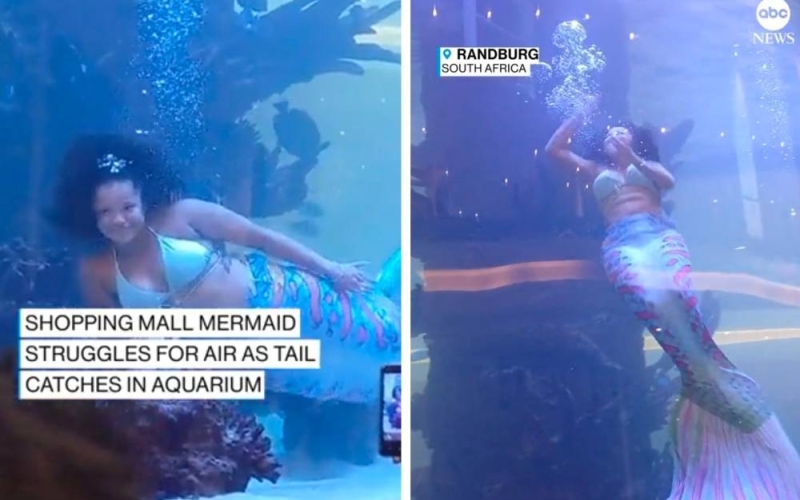 وثقت كاميرا مراقبة لحظة نجاة امرأة تعمل كحورية بحر في مركز تجاري في جنوب أفريقيا من كارثة أثناء السباحة داخل حوض السمك.