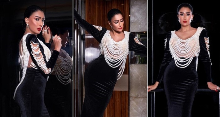مطرز باللؤلؤ.. شاهد غادة عبد الرازق تتألق بفستان باللون الأسود من تصميم سامو هجرس