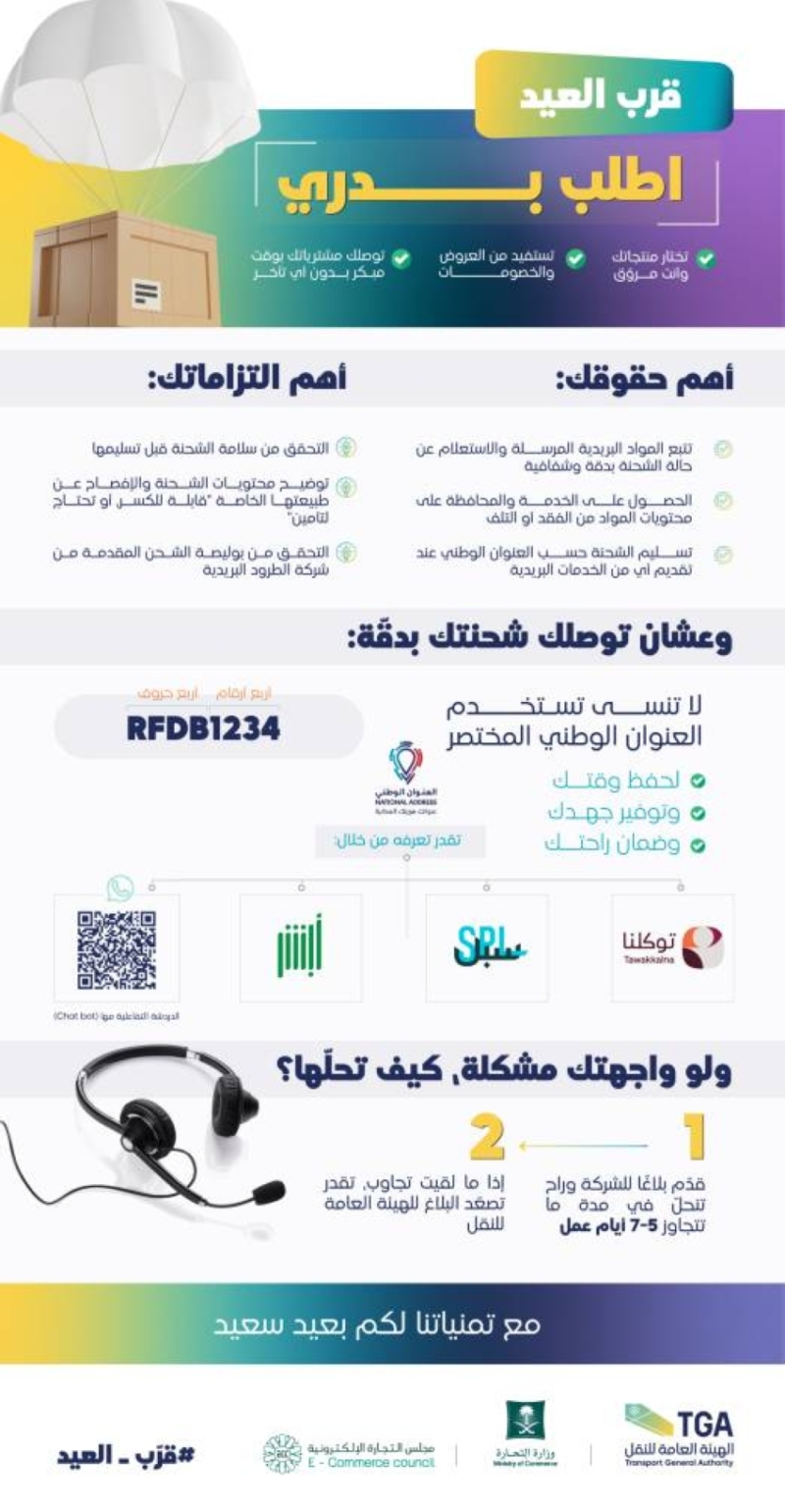 دعت وزارة التجارة والهيئة العامة للنقل المتسوقين في التجارة الإلكترونية إلى التسوق المبكر لمستلزمات عيد الفطر المبارك لتفادي ازدحام لحظات التسوق الأخيرة (لاسيما في مواسم رمضان والأعياد)، والاستفادة من حقوقهم في: “الإرجاع والاستبدال وإلغاء الطلب” وغيرها، والحصول على أفضل الخدمات المقدمة من المتاجر وشركات البريد ونقل الطرود.