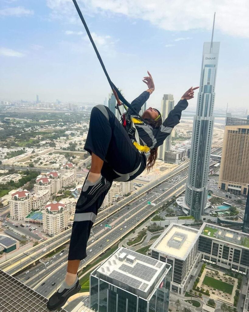 وظهرت تسابيح, وهي تتعلق في الهواء من أعلى المرتفعات بدولة الإمارات العربية المتحدة التي تقيم فيها وسط تعليقات متابعيها الذين عبروا عن دهشتهم من مغامرتها المثيرة.