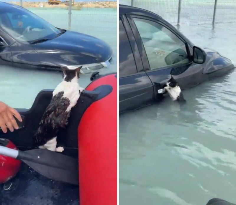 وأظهر الفيديو القط وهو ممسك في مقبض باب سيارة غارقة وسط المياه التي ملأت الشوارع، بسبب الأمطار الغزيرة.