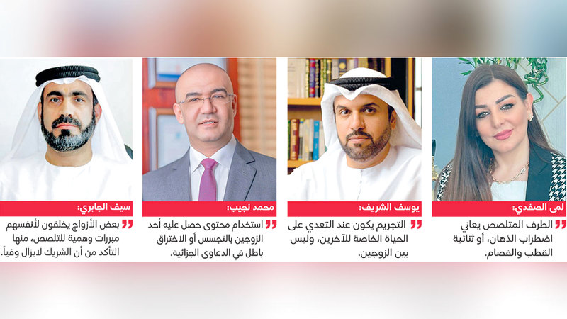 إلى ذلك أثار الجانب القانوني لمسألة التجسس أو التلصص بين الأزواج جدلاً بين مختصين، وقال المستشار القانوني الدكتور يوسف الشريف إن تصوير الأشخاص في مكان خاص، سواء الفوتوغرافي أو الفيديو يقع تحت طائلة القانون وفقاً لأحكام محكمة تمييز دبي، لكن بالنسبة للعلاقة الزوجية، فأرى أنه لا تأثيم فيها، إلا إذا كان بقصد التشهير، وفقاً لأحكام المحكمة الاتحادية العليا، أي طالما لم تنشر الصور أو الفيديوهات فلا جريمة.