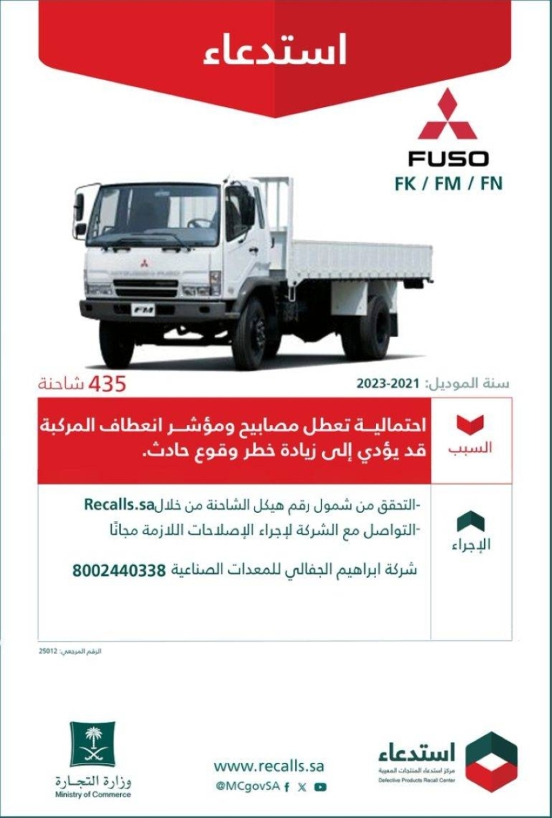 أعلنت وزارة التجارة السعودية يوم الاثنين عن استدعاء 435 شاحنة ميتسوبيشي “FUSO” من (FK / FM / FN) موديل 2021 – 2023، مُشيرة إلى أن سبب الاستدعاء يرجع إلى احتمالية تعطل مصابيح ومؤشر انعطاف المركبة، قد يؤدي إلى زيادة خطر وقوع حادث.وأشارت وزارة التجارة، إلى أهمية التحقق من شمول رقم هيكل المركبة من خلال “Recalls.sa” والتواصل مع الشركة لإجراء الإصلاحات اللازمة مجانًا.