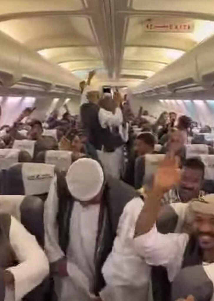 ركاب الطاشرة السودانيون, احتفلوا بالرقص عبر أغنيات الفنانة ندى القلعة, وذلك بعد سماعهم خبر تحرير الجيش للعاصمة الخرطوم, حيث رقص الرجال وأطلق النسوة الزغاريد.