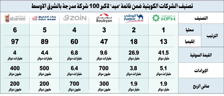 احتلت شركة المباني المرتبة السادسة كويتيا والـ 79 إقليميا، بقيمة سوقية بلغت 4 مليارات دولار، وإيرادات تقدر بـ 400 مليون دولار، وصافي أرباح بلغ 200 مليون دولار. وتعد «المباني» المالكة والمطورة لمجمع «الأفنيوز» من أبرز شركات التطوير العقاري التجاري في المنطقة، وتوسع حاليا استثماراتها في السعودية والبحرين. هذا، وتعكس بيانات الشركات الكويتية الست المدرجة في قائمة ميد تنوعا في هيكل الاقتصاد الكويتي، مع هيمنة واضحة للقطاع المصرفي الذي يشكل أكثر من 85% من إجمالي القيمة السوقية للشركات الكويتية في القائمة، كما يمثل قطاع الاتصالات محورا إستراتيجيا في ظل التوسعات الإقليمية لشركة «زين»، في حين يبرز دخول شركة المباني دلالة على أهمية القطاع العقاري التجاري في دعم النمو الاقتصادي محليا وإقليميا.وتؤكد المؤشرات أن استمرار هذه الشركات في تبني إستراتيجيات التحول الرقمي والتوسع الجغرافي يعزز من موقعها التنافسي في الأسواق الخليجية، ويعكس تطور بورصة الكويت كمنصة مالية راسخة ذات وزن إقليمي متزايد.
