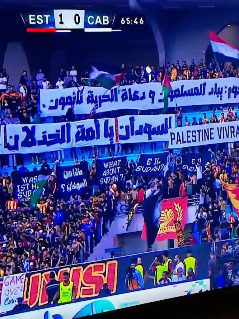 جماهير عملاق باب سويقة, رفعت لافتات أعلنت فيها دعمها للسودان, مثل “ماذا عن السودان؟” و (السودان يا أمة الخذلان), وسط هتافاتهم الداوية.