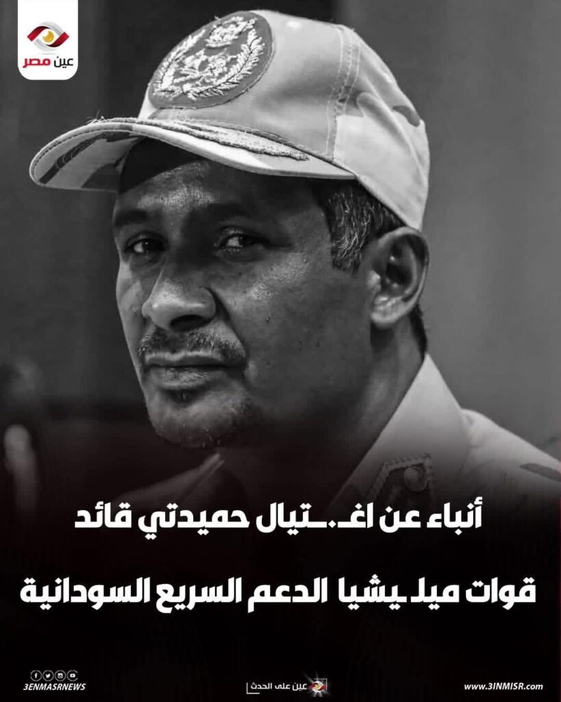 نقلت مواقع مصرية, تغريدات بعض النشطاء المصريين, تفيد عن وجود أنباء تتحدث عن إغتيال قائد مليشيا الدعم السريع, محمد حمدان دقلو “حميدتي”.