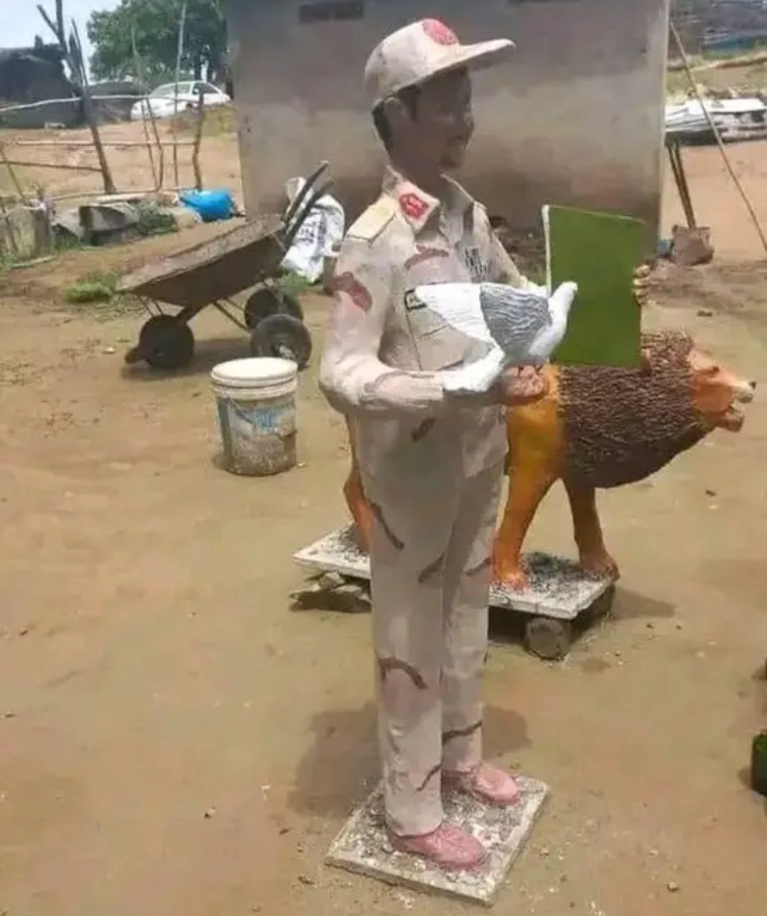 تمثال “حميدتي”, الذي تم بنائه بمواد بناء طينية وأسمنتية حسبما ذكر المتابعون ظهر وهو يحمل على يده اليمني”حمامة”, وعلى اليسرى “كتاب”, وبجواره أسد, في إشارة إلى أنه رجل سلام وشجاع.