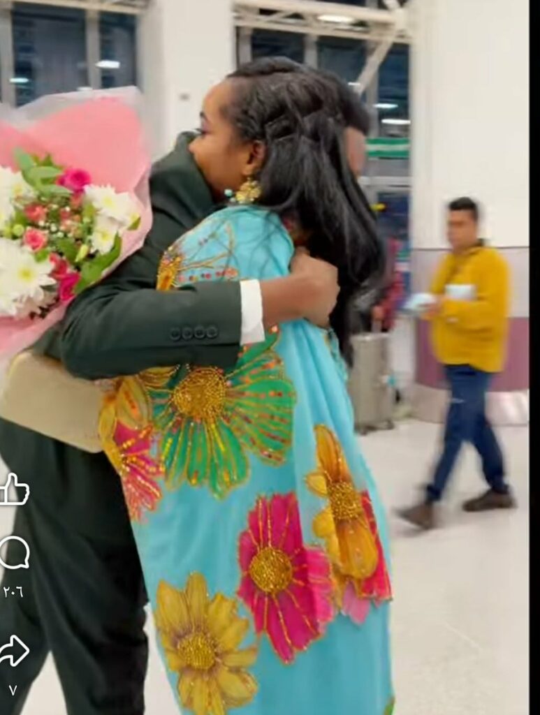 العريس الشاب احتفل بعروسه بطريقة رومانسية, حيث بادلها الأحضان, وقدم لها الورود في أول لقاء تم بينهما عقب الزواج بمطار مانشيستر, ببريطانيا.
