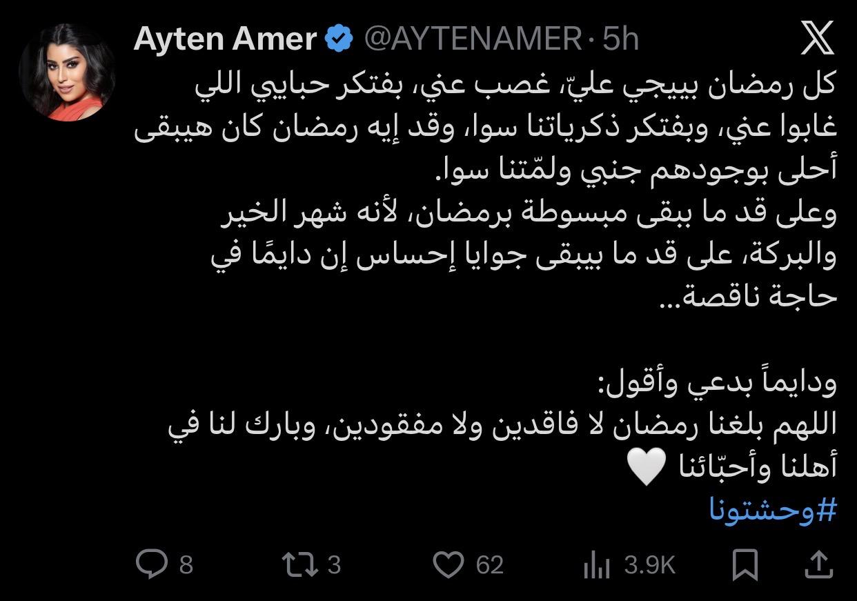 وكتبت آيتن عامر عبر حسابها الشخصي على منصة إكس: “كل رمضان بييجي عليّ، غصب عني، بفتكر حبايبي اللي غابوا عني، وبفتكر ذكرياتنا سوا، وقد إيه رمضان كان هيبقى أحلى بوجودهم جنبي ولمّتنا سوا.”