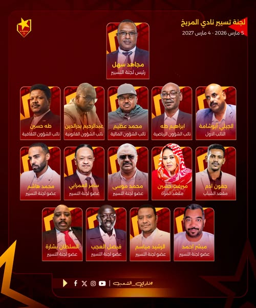 وجاء تشكيل لجنة التسيير المريخ كما هو مع إضافة عضوين, هما السلطان بشارة, وأسطورة النادي ونجمه السابق فيصل العجب.