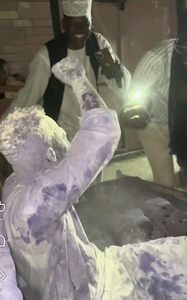 حيث قام الشباب بتلطيخ صديقهم العريس ووزيره الذي كان يجلس بجواره في “حنة” زواجه بظهرة الصابون, والبودرة, بطريقة غيرت من ملامح العريس ووزيره اللذان ظهرا بحالة يرثى لها بعد اللقطة.