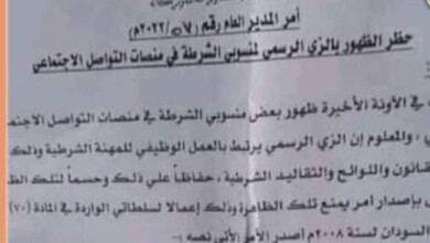 أصدرت الشرطة السوداني قرار ينص بمنع أفراد الشرطة والقوات النظامية من الظهور بالزي الرسمي في مواقع التواصل الاجتماعي بجانب عدم…
