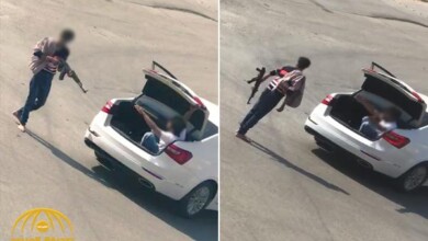 شاهد بالفيديو:مواطن مسلح يخطف شاباً ويضعه في “كبوت ” سيارته
