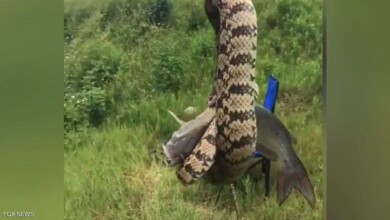 بالصور.. أفعى ضخمة “تطالب بحقها” من صياد السمك