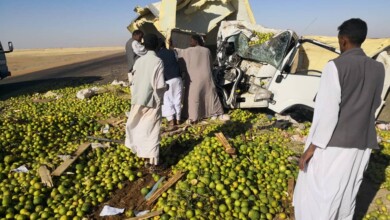 بالصور : اصطدام شاحنة مبردة “فِراخ” بــ لوري “برتقال” يؤدي بوفاة وإصابة أربعة أشخاص