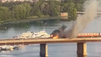شاهد بالفيديو.. النيران تحاصر ركاب قطار فوق النهر
