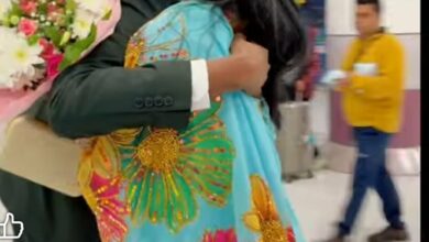 شاهد بالصورة والفيديو.. بطريقة رومانسية.. سوداني يستقبل زوجته بالورود والأحضان لحظة وصولها مطار مانشيستر ببريطانيا