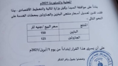 فرضت وزارة الطاقة، أسعاراً جديدة على “البنزين والجازولين” الخميس بمحطات الوقود، حيث تم تغيير سعر لتر البنزين إلى (١٥٠) جنيهاً.…
