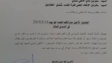 أعلنت لجنة المسابقات، تأجيل مباراة الهلال والأهلي شندي للمرة الثانية من السابعة والنصف من مساء اليوم الخميس إلى وقت لاحق…