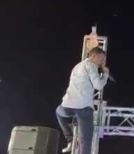شاهد بالفيديو.. أثناء إحياء حفل فنان سوداني يتسلق عمود مسرح ويقول (أنا ما بقع لانو من يتق الله يجعل له مخرجا)