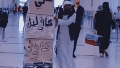 شاهد بالصورة والفيديو.. آخر تقليعات المغتربين السودانيين.. شاب سوداني “يجر” عربة بإحدى المطارات العالمية محملة بــ(العفش) ومكتوب عليه عبارة (عافي منك)