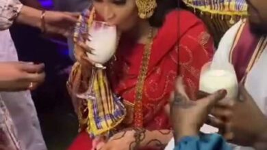 شاهد بالصورة والفيديو.. عروس سودانية تباغت عريسها وترشه بــ(اللبن) والمعازيم الحاضرون الفرح يهتفون لها: (دبلي ليهو دبلي ليهو)