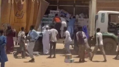 شاهد بالصورة والفيديو.. في السودان.. مواطنون يقومون بنهب دفار إحدى الشركات في وضح النهار وأمام المارة ويسرقون منه الدقيق والمواد الغذائية ومتابعون: (الظروف صعبة والقادم أسوأ من كدة)