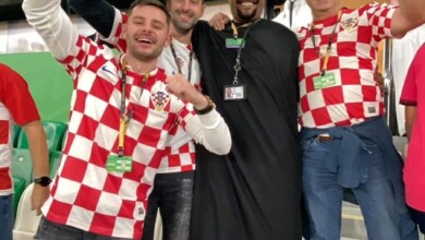 شاهد بالصورة.. جمهور كرواتيا يحتشد أمام شيخ الأمين بعد فوز منتخبهم على البرازيل في مباراة شهدها الشيخ من داخل الملعب والجمهور: (بركاتك يا شيخنا وابقى عشرة على المغرب)