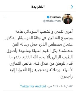 نعى رئيس مجلس السيادة الانتقالي الفريق أول ركن عبدالفتاح البرهان الفنان الراحل واستاذ علم الصوت بجامعة السودان الدكتور عثمان مصطفى فى تغريدة له بالصفحة الرسمى للمجلس بالفيس بوك اطلعت عليها ( كوش نيوز) وعدد البرهان فى تغريدته مأثر الفقيد ودوره فى اثراء الفن السودانى بروائع الاغنيات المحتشدة بالقيم النبيلة