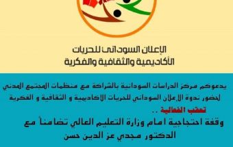وبحسب سونا، سيتم في الندوة التوقيع على إعلان الخرطوم للحريات الأكاديمية والثقافية والفكرية،ويعقبها وقفة احتجاجية أمام مباني وزارة التعليم العالي والبحث العلمي، وتسليم مذكرة للوزيرة.