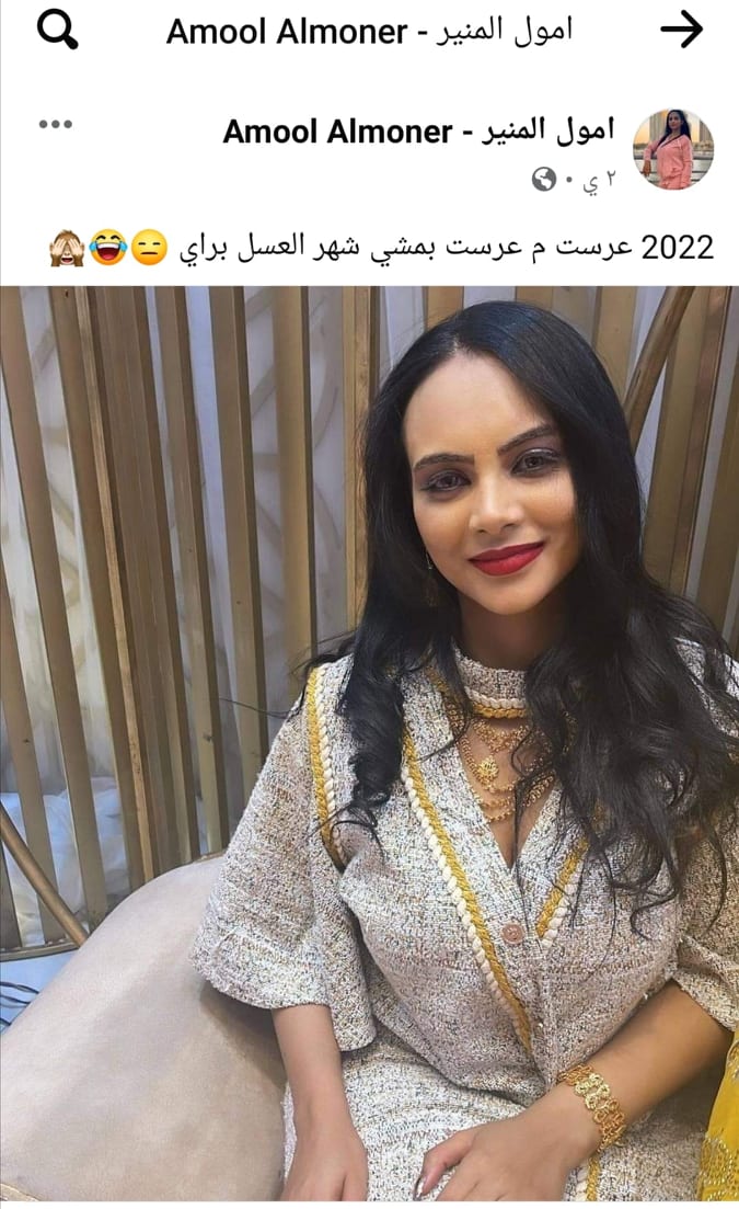 نشرت نجمة السوشيال ميديا السودانية والمقيمة بالخليج أمل المنير صورة لها عبر أحدى صفحاتها الكبيرة على عملاق مواقع التواصل الاجتماعي فيسبوك.