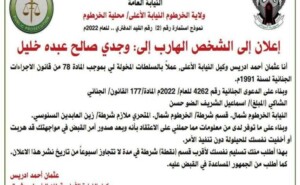 وصدر الإعلان من وكيل النيابة الأعلى/ محلية الخرطوم- الخرطوم شمال عثمان أحمد إدريس، معنوناً إلى “الشخص الهارب إلى: وجدي صالح عبده خليل”، وعملاً بالسلطات المخولة له بموجب المادة 78 من قانون الإجراءات الجنائية لسنة 1991م. وبناءً على الدعوى الجنائية رقم 4262 للعام/ 2022م المادة/ 177 القانون/ الجنائي، والشاكي فيها (المبلغ) إسماعيل الشريف الضو حسن- (النيابة الخرطوم شمال. قسم شرطة/ الخرطوم شمال. المتحري ملازم شرطة/ زين العابدين السنوسي).