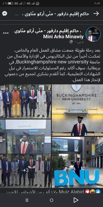 نال حاكم إقليم دارفور مني اركو مناوي درجة البكالوريوس من إحدي الجامعات بدولة بريطانيا.