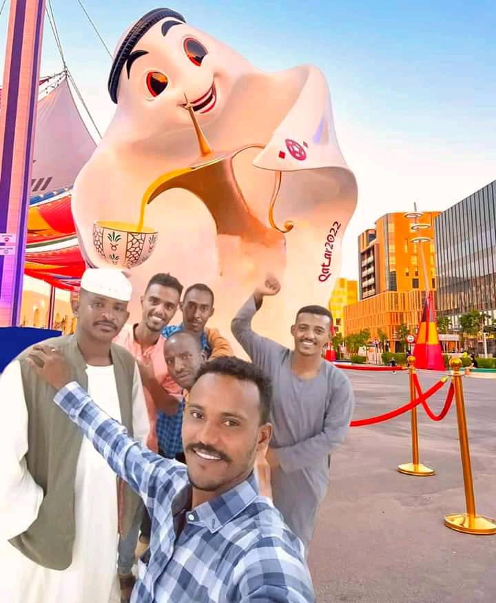 نشر محبي الفنان السوداني المثير للجدل عبد الله علي الشهير باسم ودار الزين صورة له مع جمهوره وأصدقائه وهي يقف أمام “تميمة” كأس العالم بقطر “لعيب”.