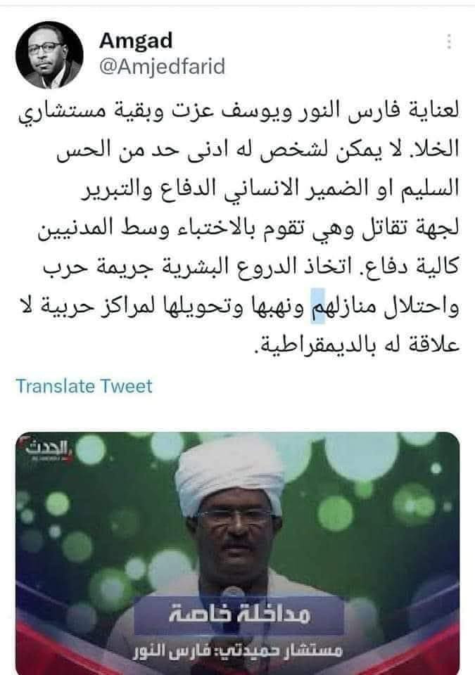 وختم مستشار رئيس الوزراء السابق تدوينته التي رصدها محرر موقع النيلين: (اتخاذ الدروع البشرية جريمة حرب واحتلال منازلهم ونهبها وتحويلها لمراكز حربية لا علاقة له بالديمقراطية).