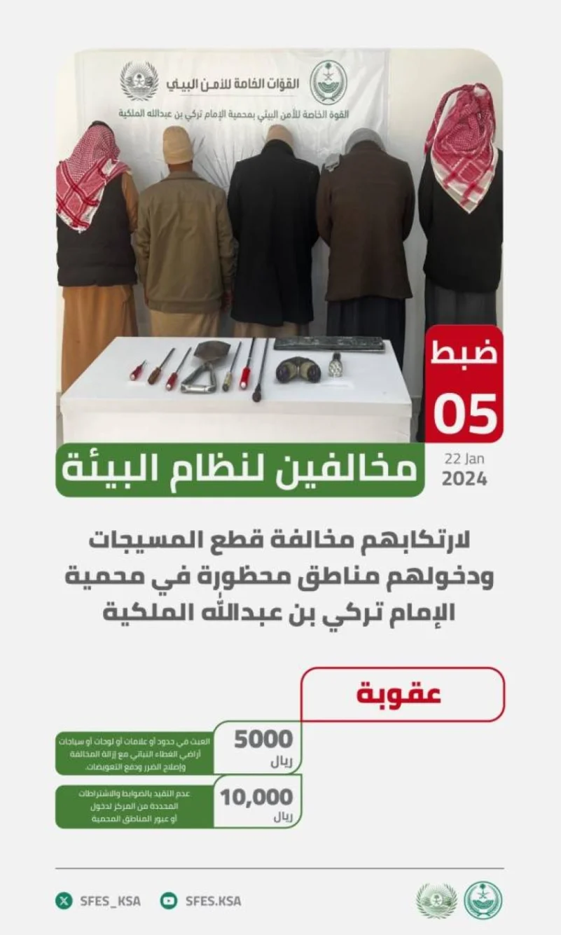 ضبطت القوات الخاصة للأمن البيئي (5) مواطنين مخالفين لنظام البيئة، لارتكابهم مخالفة قطع المسيجات ودخولهم مناطق محظورة لغرض البحث عن نبات الكماة (الفقع) في محمية الإمام تركي بن عبدالله الملكية.
