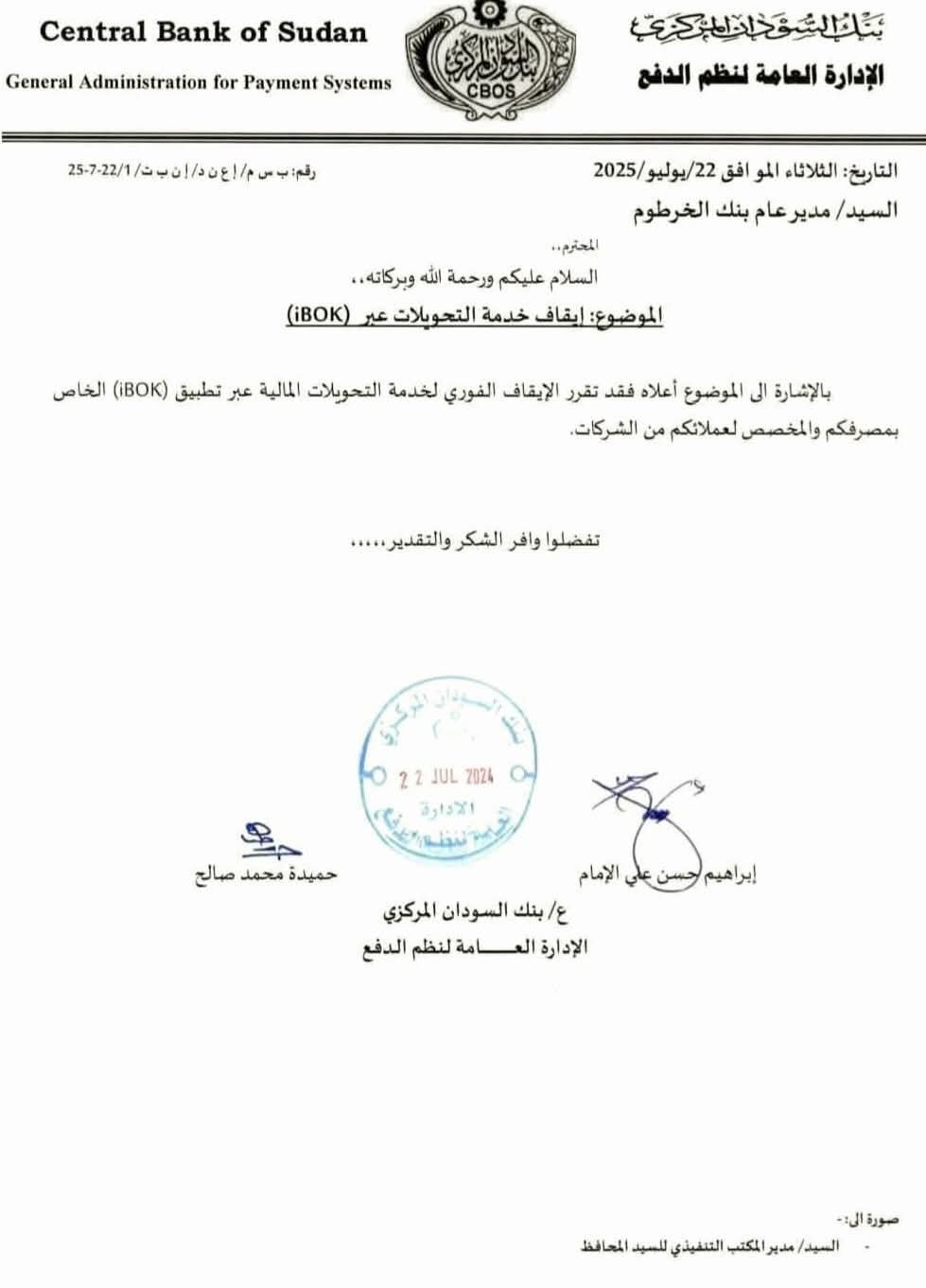 أصدر بنك السودان المركزي – الإدارة العامة لنظم الدفع، قرارًا رسميًا بإيقاف الخدمة الفورية لتحويل الأموال عبر تطبيق (iBOK)، الذي يُستخدم من قبل البنوك المحلية لخدمة عملائها من الشركات.